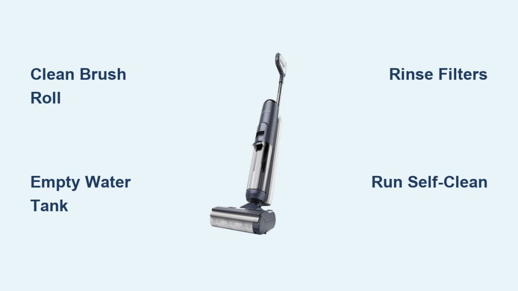 | After Every Use | Empty dirty water tank, rinse brush roll, and run self-clean cycle | 5-10 minutes |